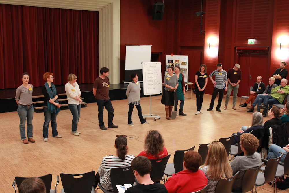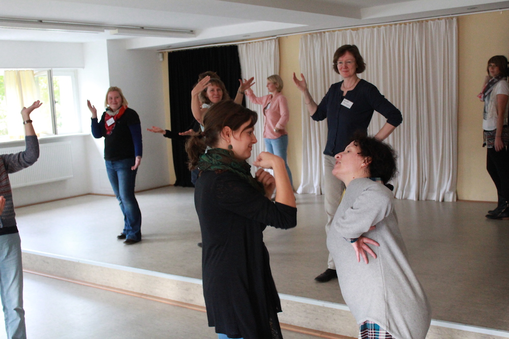 Yasmina Ouakidi stellt unterschiedliche Übungen aus verschiedenen Phasen der Theaterpraxis vor. In einem Schnelldurchlauf erfahren die Teilnehmer mit Wahrnehmungs-, Vertrauens- und Lockerungsübungen den Mut zum Spiel. Bewegungs-, Schauspiel- und Improvisationstraining sind ebenso Thema wie die kreative und spielerische Auseinandersetzung mit den Inhalten. Das An- und Abspielpotpourri wird zum gemeinsamen Theater.